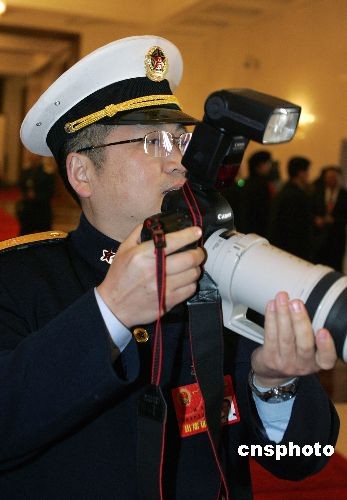 3月10日上午,十一届全国人大一次会议在北京人民大会堂举行第三次全体会议,精通摄影的全国人大代表、新晋海军少将汪玉为出席会议的解放军代表团拍照。汪将军系海军装备研究院某研究所副所长兼总工程师。中新社发 任晨鸣 摄
