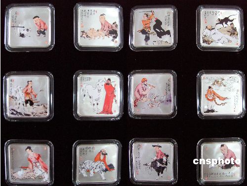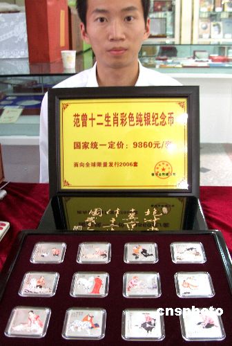 7月24日,由香港金币总公司出品、被中国人民对外友好协会选定为正式外事国礼的国内首套完整版《十二生肖纯银彩色纪念币》登陆湖北宜昌市发行。据悉,《十二生肖纯银彩色纪念币》以“十二生肖”为主题,在设计上借鉴了中国古代生肖钱币的部分理念,采用中国画中的写意技法,首次将中国古代人物形象与“十二生肖”著名典故结合,活灵活现地再现了具有鲜明民族风格的十二生肖形象。纪念币的正面图案为生肖名称,背面图案为当代著名国画大师范曾设计的“十二生肖图”,每枚纪念币重1.5盎司,方形,贸易面值50美元,成色99.9%纯银。中新社发 刘君凤 摄