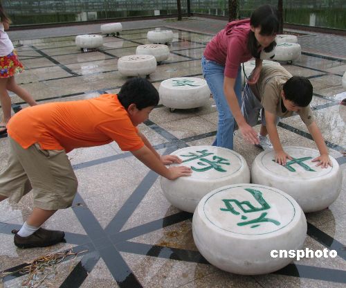 由美国、奥地利和日本等国五十多名海外华裔青少年组成的“中国少林文化行”夏令营营员,七月二十九日在郑州市第四十七中学与该校学生交流联欢,同台献艺,同场竞技。同一个蓝天,同一个梦想,孩子们在这里找到了共同的乐趣和愿望。中新社发 胡珂 摄