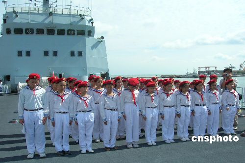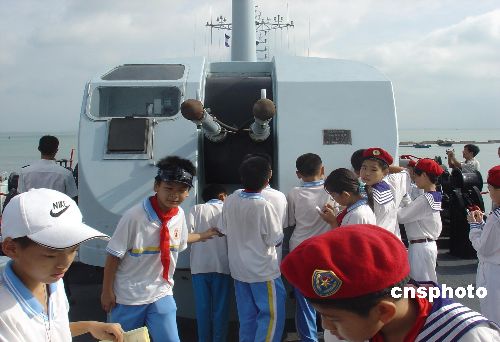 图为学生们认真记录武器装备性能。“八一”到来之际,南海舰队某部为驻地少年学生举办了一场军事日活动。学生们和舰员一起整理内务,参观舰上的武器装备,还与官兵们在甲板上联欢,体验当水兵的光荣。中新社发 符祥冰 摄