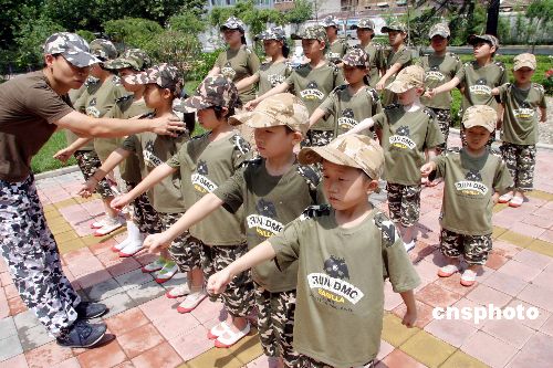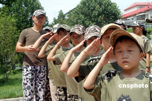 8月4日,在济南市社会福利院,福利院的孩子们正接受军训。暑假期间,福利院针对孤残儿童的自身特点,组织了这次特殊的军训,旨在提高孩子的身体素质,磨练顽强、坚韧、吃苦的性格。中新社发 龚辉 摄