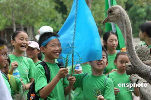 2006年8月13日,郑州天天外国语学校组织小学生参观郑州鸵鸟园,众多小学生帮助鸵鸟喂食并与鸵鸟合影,度过快乐暑期。中新社发 陈代述 摄