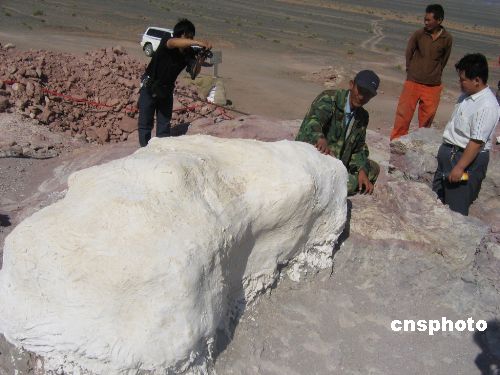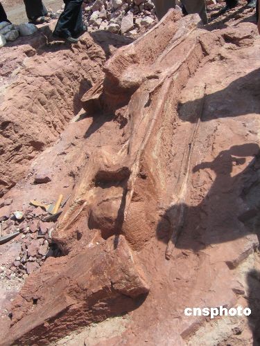 八月二十六日,新疆恐龙挖掘现场一号点发现了形态保存完整的蜥脚类食草恐龙颈椎骨化石,此次挖掘的蜥脚类食草恐龙是迄今亚洲最大的,长约三十米,高约十米。同时在新疆恐龙挖掘现场二号挖掘点,中科院专家发现迄今世界上最大的食肉性恐龙——“剑龙化石”。据中科院专家介绍,此次发现的“剑龙”长七米,高三米。恐龙化石较完整,中新社发 陶拴科 摄