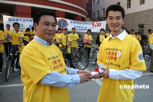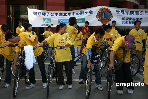 | 9月10日,是第4个“世界预防自杀日”。由北京狮子会与北京吉利大学一支30名学生作为志愿者的团队以骑单车的形式进行宣传。自2003年9月10日世界卫生组织和国际自杀预防协会共同确定的全球第一个“预防自杀日”之后, 每年9月10日,世界各地都会在这一天开展相关的宣传活动,以此传播与预防自杀有关的知识,借以唤起社会各界对自杀问题的关注,挽救那些试图自杀者的生命,共同提高公众对自杀问题重要性以及降低自杀率的意识。中新社发 李堃 摄