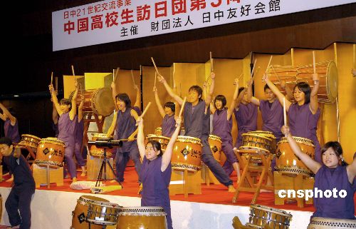 第三批中国高中生访日代表团十一日在东京开始他们此行的第一个访问日程。图为东京深泽高中的日本学生在当天晚间的欢迎仪式上表演和式大鼓,欢迎应邀来访的中国同年人。根据日方有关计划安排,今年共将邀请一千名中国高中生访问日本。中新社发 王健 摄