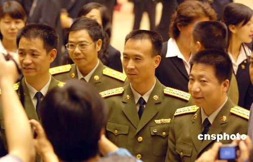 十月三十日晚,中国三位航天员杨利伟、费俊龙、聂海胜齐亮相第六届中国(珠海)国际航空航天博览会开幕式,受到与会嘉宾的追捧,纷纷要求与他们合影。中新社发 陈文 摄