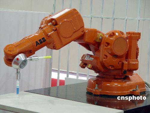 2006中国国际工业博览会11月1日在上海拉开帷幕。本届工博会上20多种中外机器人比拼绝活的赛场,跨国企业ABB公司在本届工博会上展示了具有人机交互能力的绘图机器人“神笔马良”。只需观众在它指定区域坐下,“马良”就能拿起画笔在两分钟后画出一张逼真的人物素描。这一画画绝活,体现了从图像采集、人脸识别、轨迹规划到漫画绘制等一系列机器人系统综合控制水平。中新社发 杨明静 摄
