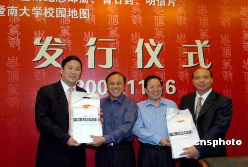 十一月十六日,是暨南大学百年校庆日。《暨南大学建校100周年100版纪念特刊》暨珍藏缩印本发刊仪式、百年暨南丛书·暨南文丛首发式、百年暨南纪念邮册、首日封、明信片发行仪式在暨南大学举行。当日学校还举行了孔子像揭幕仪式,校长胡军、副校长陆大祥、校董梁仲景等为孔子像揭幕。中新社发 刘卫勇 摄