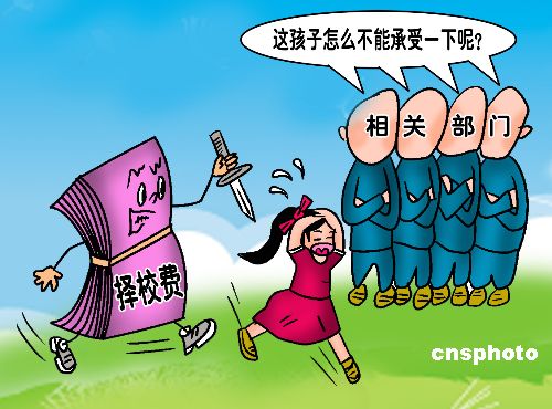 江苏盐城市射阳县实验小学的13岁女生夏宁,由于在参加当地一热点民办初中的择校考试中发挥失常,加上家里经济困难,父母无力筹足近2万元的费用,在写下遗书后,毅然离开了和她一起生活了13年的父母和爷爷奶奶。 13岁的花季女孩,却因为2万元的择校费选择自杀。而这还不是孤例,2005年7月份,宁夏银川市13岁的小学毕业生秀秀(化名)也是因为择校费,永远地离开了人间,“我死了可以帮您节约10万元”等字眼,深深地刺痛着人们的心。 孩子的家人该是何等的痛心,不难想象。只是,作为旁观者,我们,还能说些什么呢?中新社发 李华<漫画> 摄