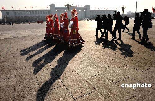 三月五日上午九时,十一届全国人大一次会议在北京人民大会堂隆重开幕。摄影记者在天安门广场穷追不舍拍摄穿着少数民族服饰的亮丽女服务员。中新社发 廖攀 摄
