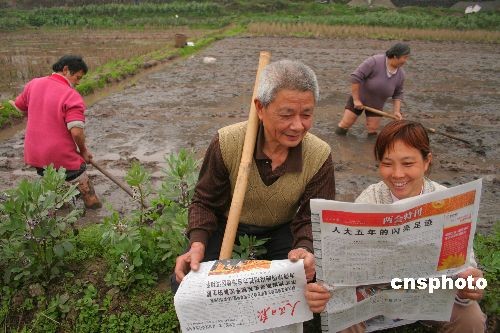 3月5日,重庆荣昌县杜家坝村农民在春耕的休息间隙,一起阅读登载有两会消息的人民日报。连日来人民日报上“两会特刊”中有关农民生产、粮食生产与新农村建设等方面的相关信息,引起当地春耕农民的密切关注。中新社发 朱芸锋 摄