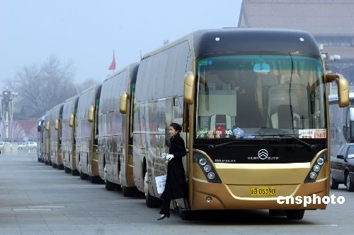 2008年3月8日,停在北京天安门广场、全国政协十一次会议会场外的环保节能大巴。据悉,这种平均百公里油耗不到5升的环保大巴是首汽首次为“两会”代表团提供服务。此外,为营造奥运年气氛,“两会”服务车的内前挡风玻璃下方都摆放了北京奥运会吉祥物福娃。中新社发 张朋 摄