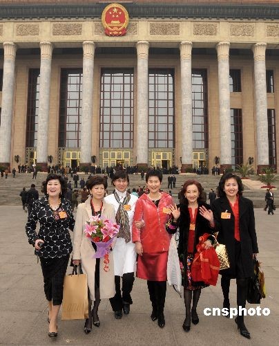 三月八日,国际劳动妇女节,全国政协女委员参加完大会笑容灿烂走出北京人民大会堂。中新社发 廖攀 摄