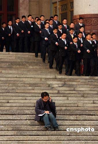 三月八日上午,全国政协十一届一次会议第二次全体会议在北京人民大会堂举行,十四位政协委员围绕经济建设和社会建设等问题作大会发言。会后,一名忙碌的记者坐在台阶上与列队而出的两会服务人员相映成趣。中新社发 盛佳鹏 摄
