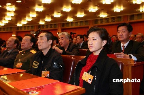 3月13日下午3时,全国政协十一届一次会议第四次全体会议在北京人民大会堂举行,会议的主要议程是选举政协第十一届全国委员会主席、副主席、秘书长和常务委员。宋祖英与张艺谋相邻而坐认真听会。中新社发 盛佳鹏 摄