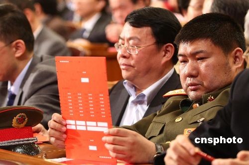 3月13日下午,全国政协十一届一次会议在北京人民大会堂举行第四次全体会议,选举贾庆林为新一届政协主席,王刚等二十五人为副主席,钱运录兼任秘书长,同时选举产生二百九十八名政协常委。图为毛泽东之孙毛新宇委员(右)在投票前细览选票。中新社发 盛佳鹏 摄