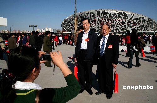 来自山东烟台的张江汀(左)、宫学斌代表在“鸟巢”前合影留念。
