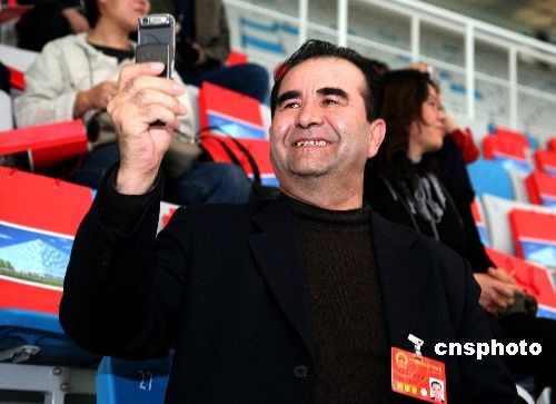 在国家游泳馆,来自新疆代表团的努尔拉·阿尤甫代表在用手机拍摄“水立方”场内景。
