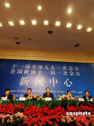 三月十四日下午,银监会及有关负责人、部分全国人大代表,在大会新闻中心就银行业支持“三农”和小企业发展工作情况,接受中外记者集体采访。中新社发 王东明 摄