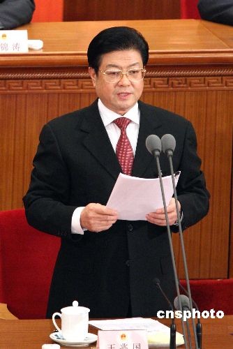 3月15日上午,十一届全国人大一次会议第五次全体会议在北京人民大会堂举行,吴邦国当选为十一届全国人大常委会委员长,王兆国等当选为副委员长,李建国当选为秘书长。图为王兆国主持会议。中新社发 张宇 摄