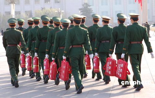 3月16日上午,武警官兵携带灭火器等消防设备列队行走在北京天安门广场上。中新社发 刘万强 摄