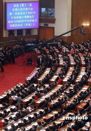 3月18日上午九时,十一届全国人大一次会议在北京人民大会堂举行闭幕会,人大代表按表决器,表决各项草案。中新社发 张宇 摄