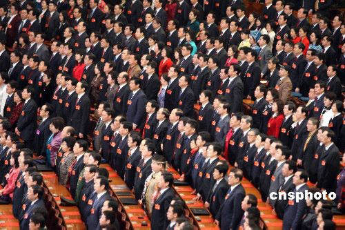 3月18日上午,十一届全国人大一次会议在北京人民大会堂闭幕,全体代表起立,高唱国歌。中新社发 张宇 摄