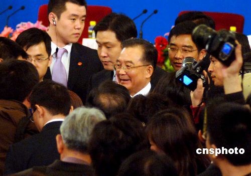 三月十八日上午,十一届全国人大一次会议在北京人民大会堂闭幕,国务院总理温家宝会见中外记者并答记者问。图为会后温家宝走到记者席与大家握手问候。中新社发 王东明 摄