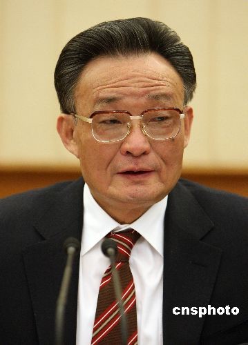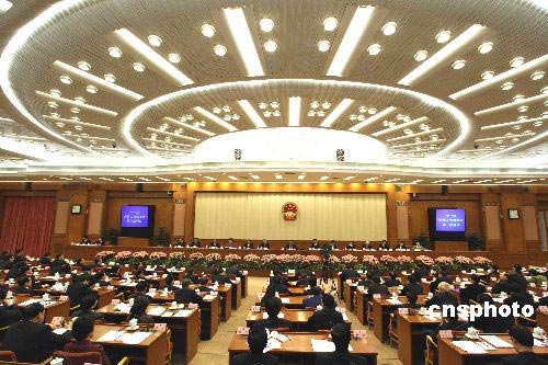 第十一届全国人民代表大会常务委员会第一次会议3月19日上午在北京人民大会堂举行,会议通过任命王万宾、乔晓阳、张少琴、曹卫洲、王庆喜、李连宁、何晔晖(女)、孙伟、刘振伟为全国人民代表大会常务委员会副秘书长,吴邦国委员长发表讲话。中新社发 任晨鸣 摄
