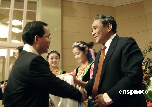 原全国人大常委会副委员长、西藏自治区发展咨询委员会名誉主任热地十九日在北京说,西藏实现良性发展,青藏铁路是最有效的战略依托。图为他在西藏大厦为第二届西藏自治区发展咨询委员会委员献哈达,鼓励五十九位知名专家学者为西藏发展建设服务。中新社发 刘舒凌 摄