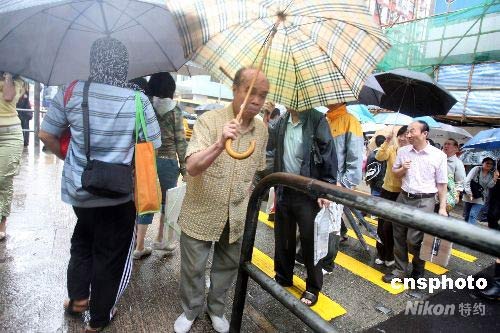四月十九日,受热带风暴“浣熊”影响,香港天文台发出三号强风及红雨警告信号,香港市区狂风暴雨,给出外的市民带来诸多不便。天文台预测未来两日不时会有大雨。中新社发 洪少葵 摄