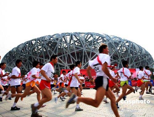 北京奥运会倒计时100天群众马拉松接力活动暨2008年北京国际长跑节,4月30日上午在北京国家体育场公共区隆重举行,活动中马拉松接力赛、群众建身长跑、群众体育展示等内容丰富多彩、气氛活跃祥和。此项活动由国家体育总局、中国奥委会、北京市政府、第29届奥林匹克运动会组委会主办。 中新社发 宋吉河 摄