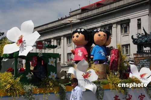 十日上午,一些推广本地经济、文化特色的花车,驶过台北市区。图中这辆由台湾“客委会”布置的花车在宣传如何弘扬客家文化。中新社发 耿军 摄