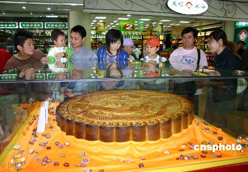 9月10日,沈阳一家月饼生产厂家展出一个名为“双龙戏月”的巨型月饼,吸引了众多消费者驻足观看。这块月饼直径1.2米、高0.2米、重250公斤,上面有双龙戏月图案,由5位烘焙师用2天时间精心制作而成。中新社发 曹精义 摄