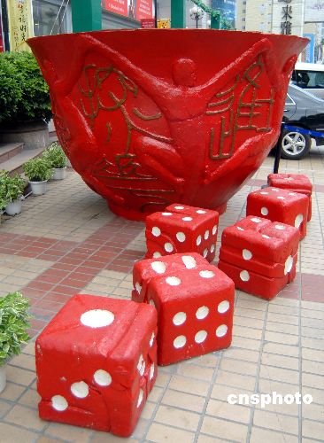 9月14日,一巨大博饼碗和色子出现在福建厦门一商场门口,吸引了过往行人的注目。该博饼碗和色子均为水泥铸成,通体红色,碗高约170厘米,直径约150厘米,碗身有手拉手欢呼的人物图案,6个色子摆成4个“4”、2个“1”的“状元”标志,每个色子重约二三十斤。据了解,博饼,是包括福建厦门在内的闽南人几百年来独有的中秋传统活动。中新社发 杨戈 摄