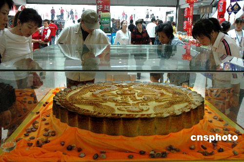 9月15日,消费者正在沈阳中街兴隆大家庭商场观看名为“双龙戏月”的巨型月饼。这个大月饼直径为1.2米,高0.2米,重250公斤,使用月饼专用粉100公斤,糖浆25公斤,进口酥油13公斤,特级花生油15公斤,纯正白莲75公斤,由5名国家特级烘焙师耗时48小时精心制作而成。这意味着月饼大战已经开始。中新社发 胡继斌 摄