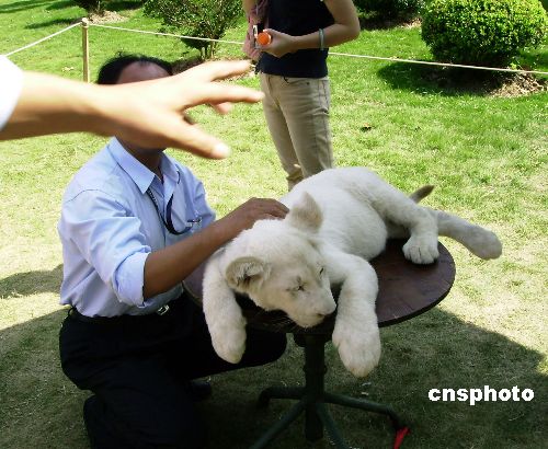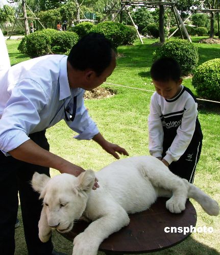 | 10月7日,一男孩凑近一只趴在桌上的小白狮,小白狮似乎快要睡着,头始终不愿抬起。一中年男子走上前,猛拽它脖子上的绳子,白狮“呜呜”低叫两声,头却抬不起来。另一男子拿来盆子,在它面前敲了几下,白狮以为是喂食了,吃力地抬起头来,摄影师迅速按下快门。当天,笔者在上海野生动物园看到不少“临时拍照点”,拍照点让游人和幼小的白狮、老虎等动物合影,收取价格不菲的“合影费”,而小动物们每天工作长达十多个小时,被主人呼来唤去,累得不像样子。中新社发 李俊锋 摄