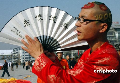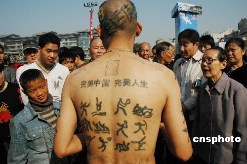 11月9日,在浙江杭州吴山广场,一名“奥运使者”向市民宣传2008年奥运会。这位自称“奥运使者”的浙江富阳男青年孙某,浑身上下充满“奥运味”:发型理成了奥运五环旗图案,上半身纹满了35个奥运项目。中新社发 朱孝钦 摄