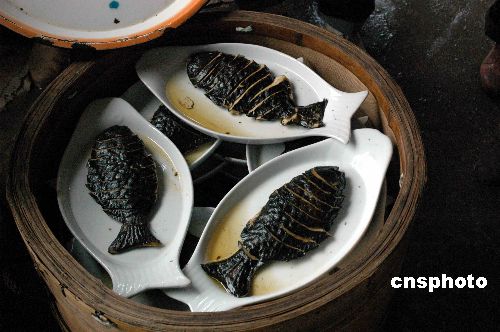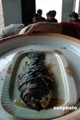 11月18日中午,在福州旗山万佛寺内一道“鱼”菜让在此用斋饭的人们大为吃惊——斋饭“鱼”如真鱼一样,有鱼眼、鱼尾,大小比例也如真鱼一样。但其实这道菜是用面筋做的,在面上加了一层黑,外观上让人难辨真假。中新社发 张 斌 摄