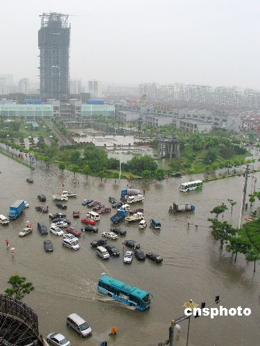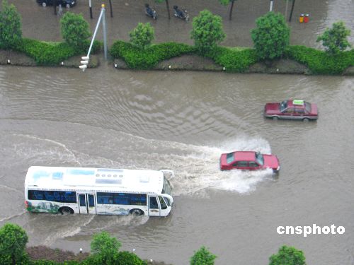 7月20日上午,一场几十年未见的暴雨袭击江苏省扬州市,使该市城市道路积水严重,市民出行受到严重影响。中新社发 王斌 摄