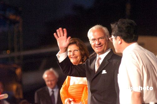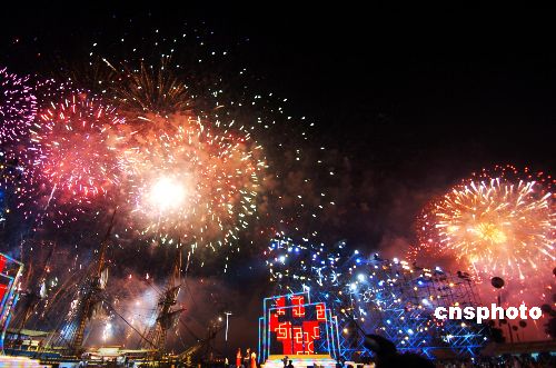 七月二十一日晚,广州市举行大型焰火晚会,欢迎瑞典“哥德堡号”仿古船来访,瑞典国王卡尔十六世·古斯塔夫与王后西尔维娅出席观看了晚会。中新社发 柯小军 摄