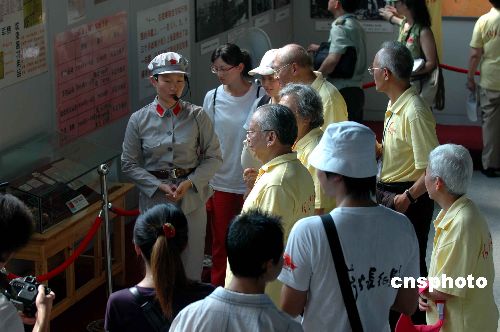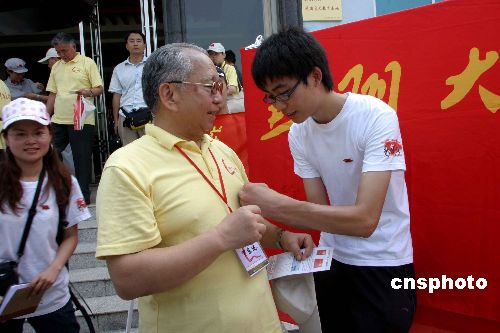 7月24日,开国元勋子女“情系长征路”与苏州大学“薪火长征路”巧遇于中央红军长征集结出发地江西于都,学生代表向开国元勋子女“情系长征路”总指挥、罗荣桓元帅之子罗东进将军敬献纪念章,罗东进勉励学生继承长征精神。今年是红军长征胜利70周年,中国各地掀起长征热。中新社发 田地 摄