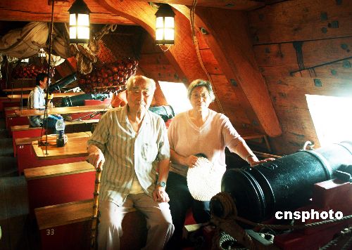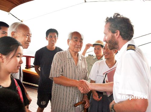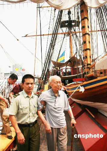 在瑞典“哥德堡号”二副的陪同下,原海南军区司令员江海将军、93岁老红军朱韬将军,7月24日下午在广州参观了来访的“哥德堡号”。中新社发 廖力华 摄