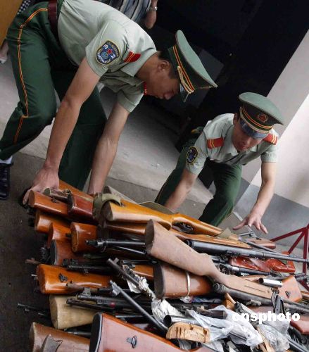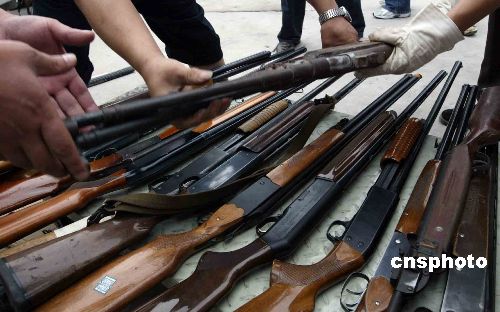 七月二十五日,北京警方将自今年六月以来收缴的非法爆炸物品、枪支弹药和管制刀具等集中送交,实施登记并进行分割、解体、毁形处理。此次集中送交的各类非法枪支五百二十三支、仿真枪八百七十九支、管制刀具一千七百八十二把。中新社发 任海霞 摄