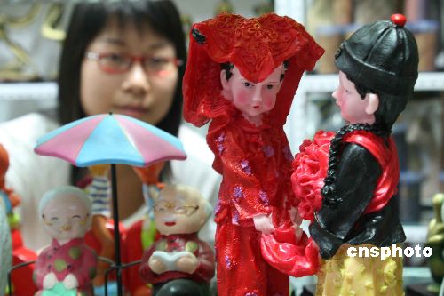 7月25日,具有民族特色的情侣玩偶在安徽阜阳一家工艺品店出售。恰逢农历闰七月,2006年中国的传统情人节“七月七”,将出现38年一遇的“双七夕”(7月31日、8月30日)。商家们已开始提早准备,制造“中国式浪漫”。中新社发 卢启建 摄