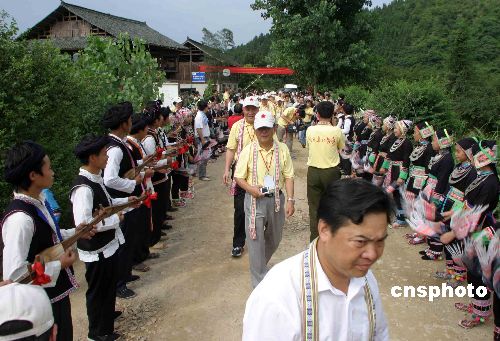 7月29日,贵州省黎平县洪州镇草坪村侗族群众以当年迎接红军的隆重礼节,欢迎重走长征路的红军后代、开国元勋子女。他们身穿节日盛装,排列村寨道路两侧,载歌载舞,向开国元勋子女献上拦路酒,挂上花带,敬上浓香的油茶,以民族传统迎接贵宾的仪式欢迎“情系长征路——开国元勋子女重走长征路”。1930年至1934年,红军曾三过黎平,与当地各族群众结下深厚情谊。中新社发 田地 摄