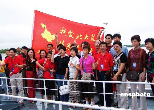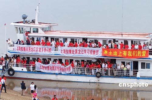 8月1日,来自北京、上海、哈尔滨的老知青登船游览中俄界河黑龙江。280余名当年在边城北大荒下乡的知识青年,回到阔别30多年的黑土地,看望拜访这里曾养育他们的父老乡亲、参加“黑龙江知青馆”开工典礼、游览五大连池等秀丽风光,追寻回顾那难忘的青春年华。中新社发 邱齐龙 摄