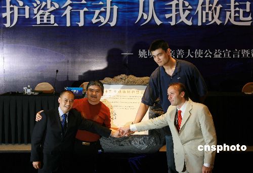 八月二日,姚明(右二)、刘欢(左二)、李宁(左一)和世界野生救援协会主席史蒂文先生共同在“全球野生动物保护宣言”上签名,并发起“护鲨行动 从我做起”的活动。在活动中,明星们共同发布了保护濒临灭绝的生物,特别是鲨鱼的宣言,号召大家从不吃鱼翅、不购买野生动物制品开始,增强保护野生动物的意识。中新社发 毛建军 摄