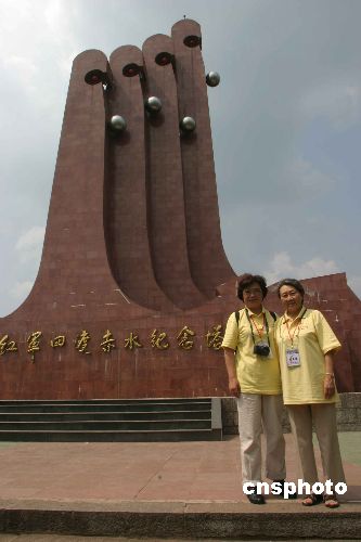 8月2日,周恩来侄女周秉德(右)、贺龙元帅之女贺晓明在遵义市仁怀县茅台镇红军四渡赤水纪念塔前合影。当日,“情系长征路——开国元勋子女重走长征路”来到茅台镇,寻觅当年红军四渡赤水的遗迹。1935年1月遵义会议后,中央红军巧妙地进行了举世闻名的四渡赤水战役,打破了敌人妄图围歼红军于川、陕、黔边境的计划,取得在战略转移中从被动到主动的转变,从失败走向胜利的转变,为完成伟大的长征奠定了基础。中新社发 田地 摄