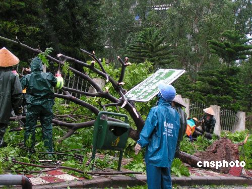 今年第六号台风“派比安”三日晚登陆广东茂名后,中心附近风力达十二级,狂风伴随暴雨肆虐整个茂名地区,造成当地不少市政设施受到损坏,市政人员加紧清除路障。中新社发 梁远东 摄